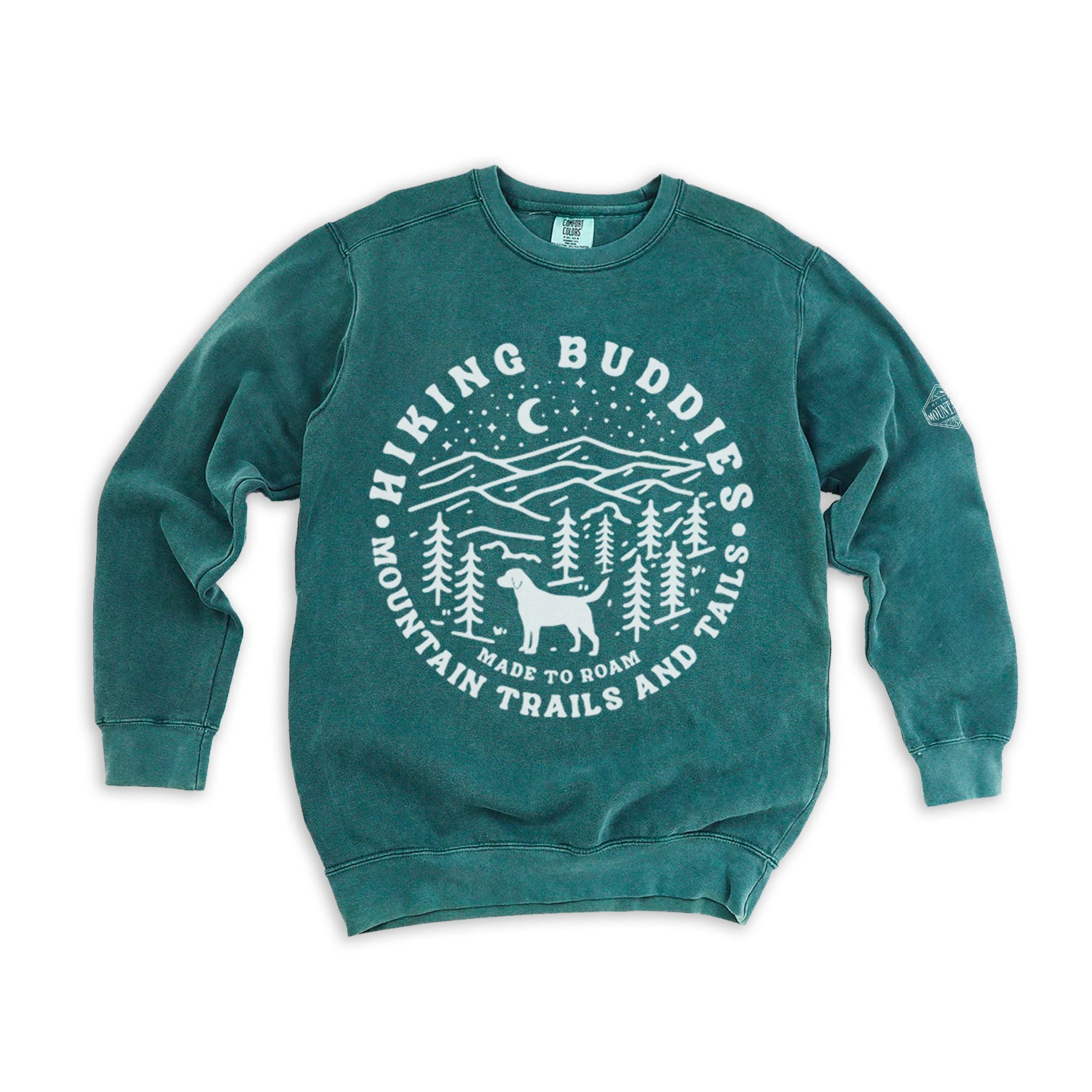 Hiking Buddies Mountain Tails & Trails Crewneck Sweatshirt. Dogs truly make the best hiking buddies so grab your furry friend & head to the trail. This pre-shrunk 100% ring-spun cotton Blue Spruce crewneck utilizes a pigment dyed garment process to achieve vintage, lived-in look and feel long before it ever hits our shelves.