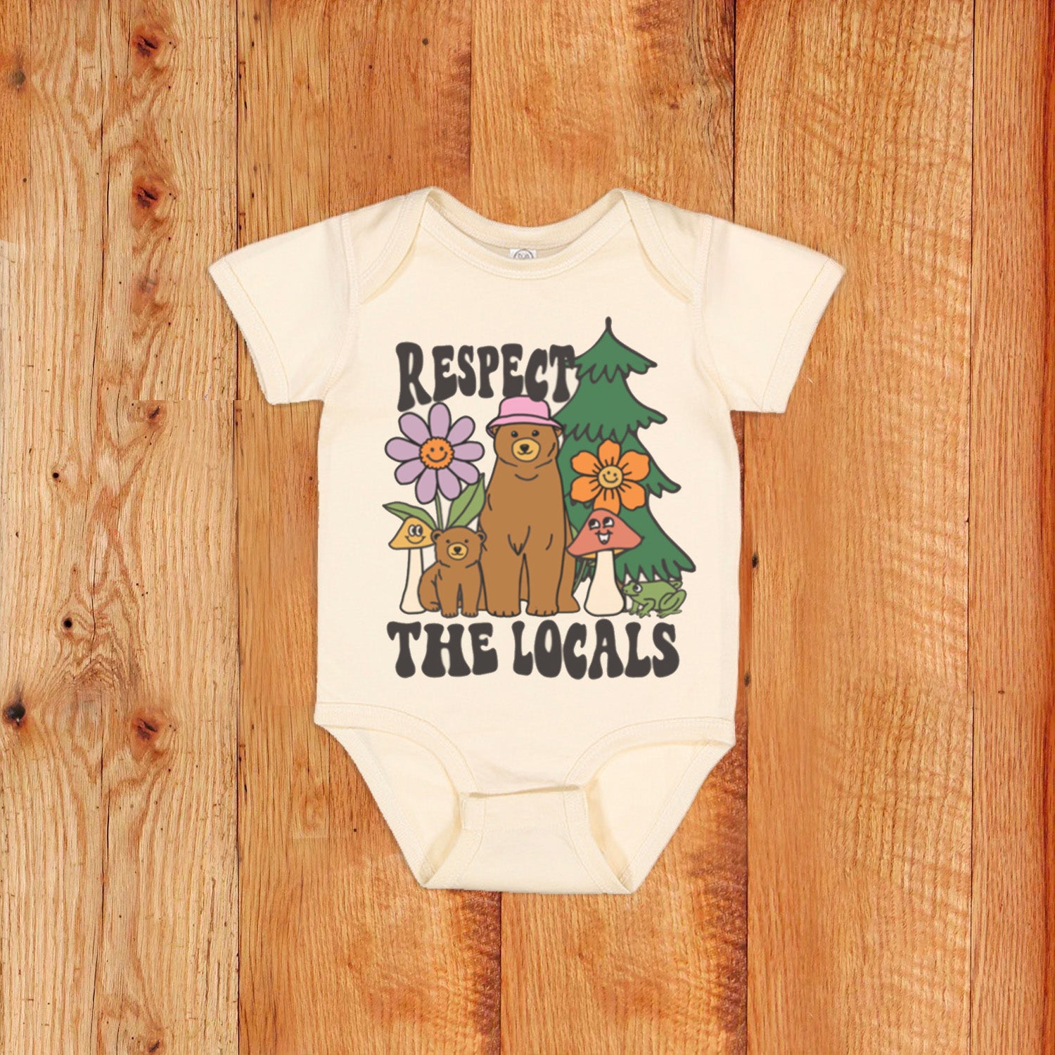 Respect the Locals Baby Onesie. Because they were here first!Ā Cut from soft, ringspun cotton with a 3 snap closure in natural.Ā