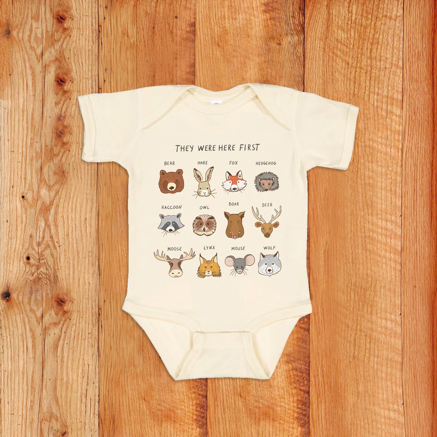 They Were Here First Baby Onesie. In honor of our forest friends who were here first.Ā Cut from soft, ringspun cotton with a 3 snap closure in natural.Ā