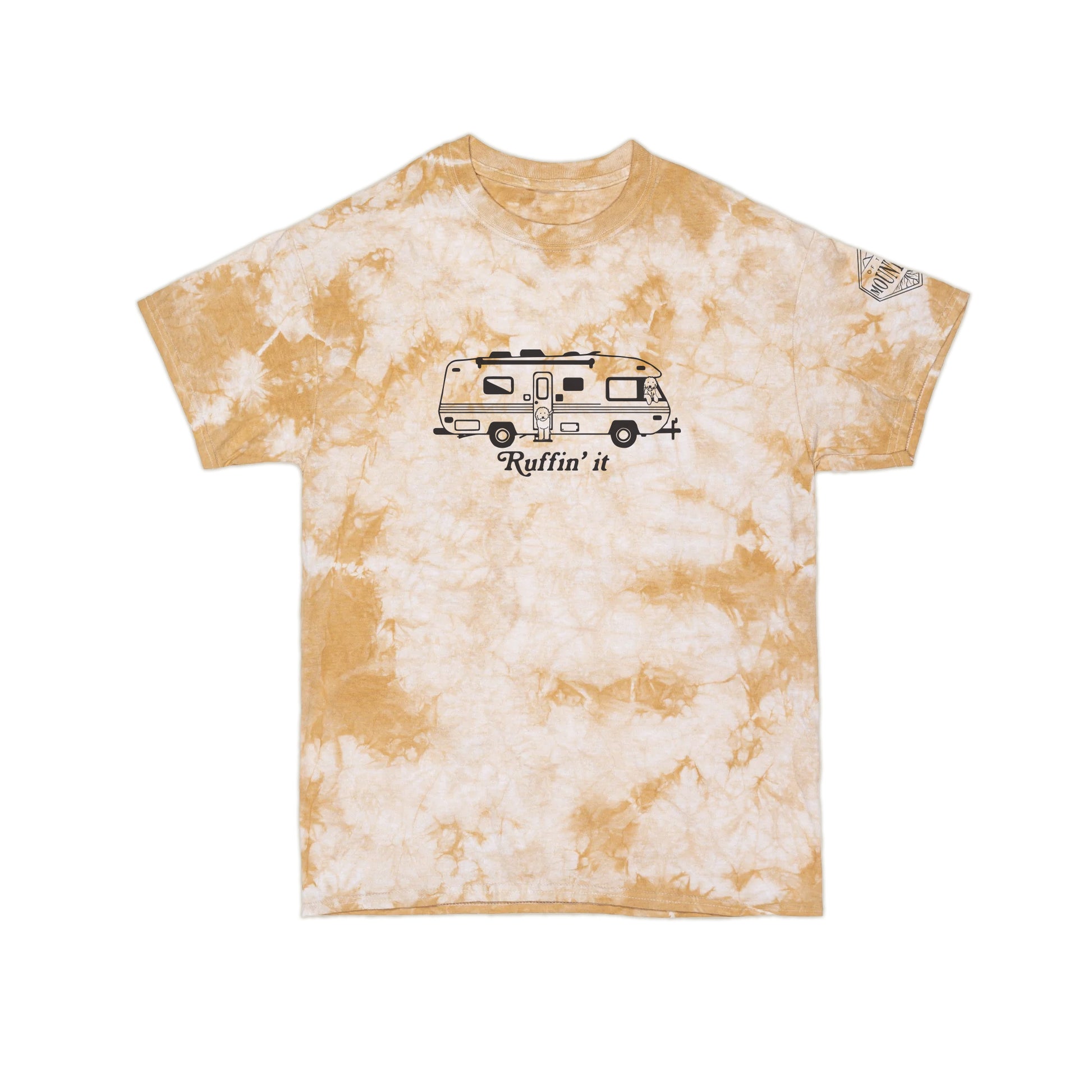 Ruffin' It Kids Tie Dye Tee.Ā A simple hand drawn illustration of a retro airstream and 2 pups!Ā Cut from soft, ringspun cotton in a standard fit with short sleeves & a ribbed knit crew neck for comfort and style in Crystal Honey.